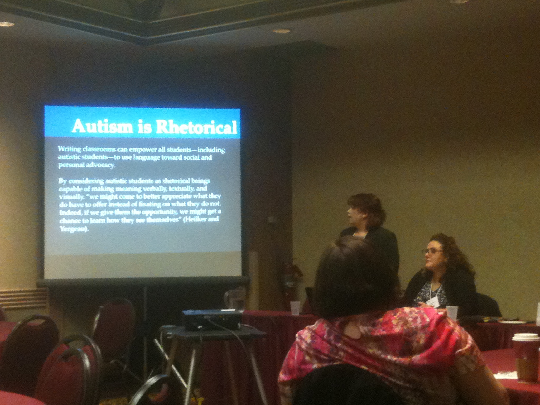 The next session, “Socially Built Environment Surrounding Disability” had a great Speaker 2, who I believe was Rochelle Gregory of North Central Texas College. I arrived near the end of her speech. She discussed, autism is rhetorical. When we better understand the perspectives of people with autism, it will help better communication between each other. I know I’m being super general, but I didn’t take notes, and only caught the closing. Please click on the picture below to read the slide. Good stuff.