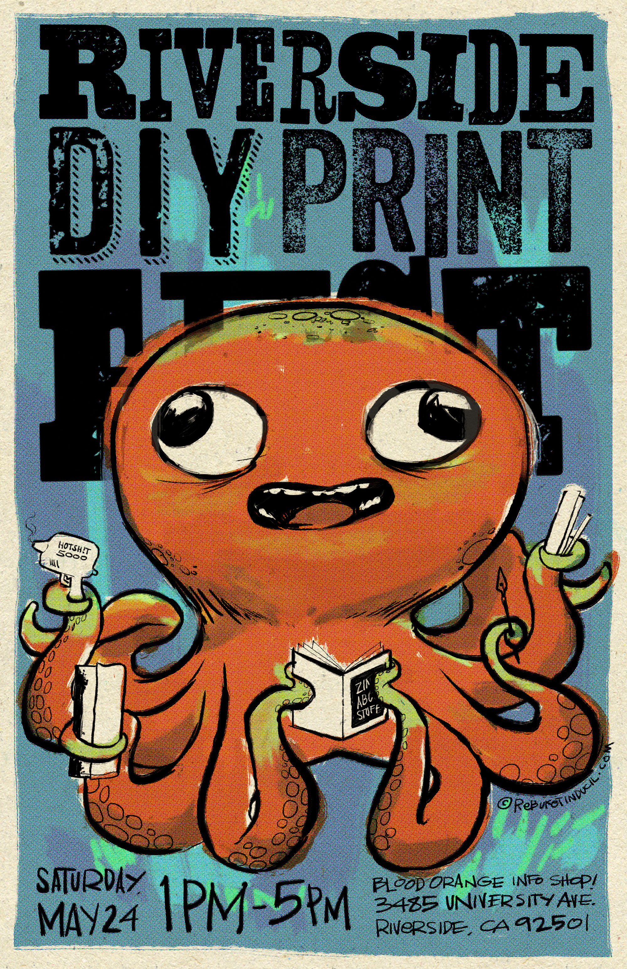 This is coming up! Riverside DIY Print Fest, Saturday May 24, 2014. 1-5pm, free at Blood Orange Infoshop!